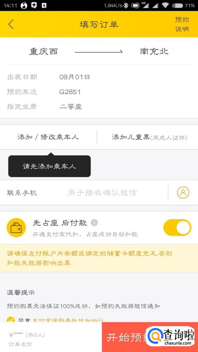 填写乘车人和接受电话,点击“开始预约”,就可以坐等飞猪抢票了,抢票成功之后不要忘记来付款哦!