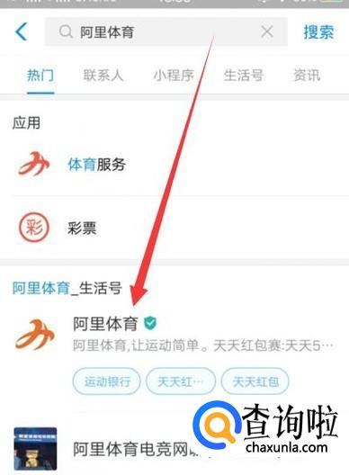 进入之后,搜索“阿里体育”,点击并进入,如图所示。