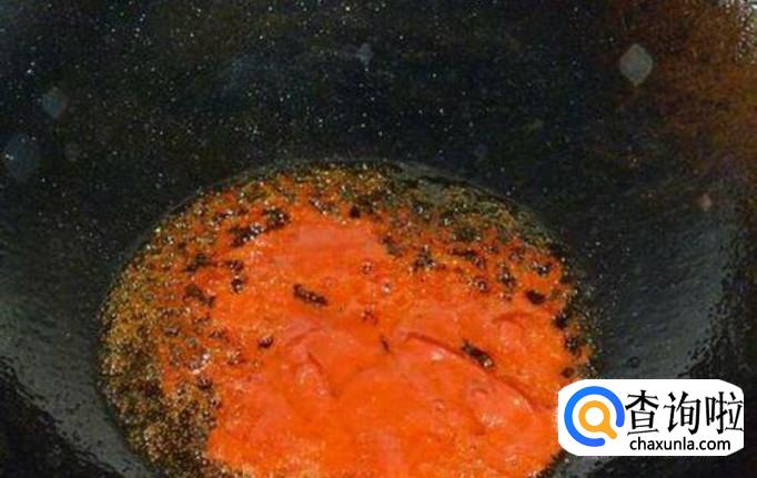 将油大部分倒出,下入翻茄酱炒香,加入料酒,清水,盐,白糖,白醋。