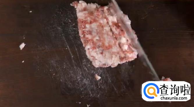等到粉丝的芯变白之后,用剪刀将粉丝剪成小段。接下来取去皮的五花肉,切末。
