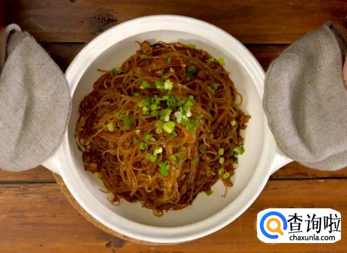 之后把砂锅放到火上烧热,倒入粉丝,撒上葱花,浇一点麻油就完成啦。