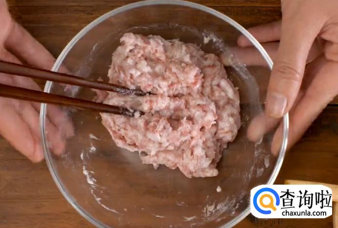 然后把肉末装到碗中,加少许盐、生粉、黄酒搅拌均匀,腌制一会。