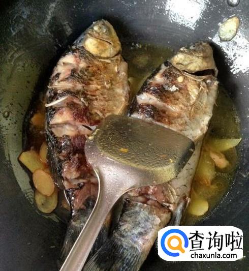 将鱼轻轻翻炒一下,然后,加入适量清水,盖上锅盖,开大火炖煮。