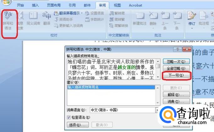 在通读文章的基础上,我们也可以选择点击“拼写与语法”按钮,快速找到拼写和语法有疑义的地方,起到辅助检查的效果。