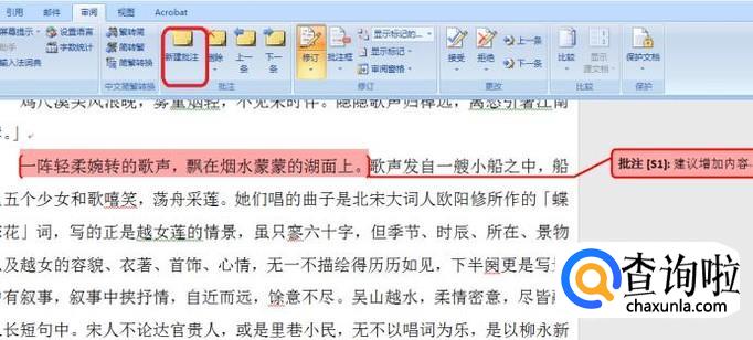 如果对文章内容有自己的建议,可以选中内容,然后点击“新建批注”,如图所示,直接在批注后面写上自己的想法就行。