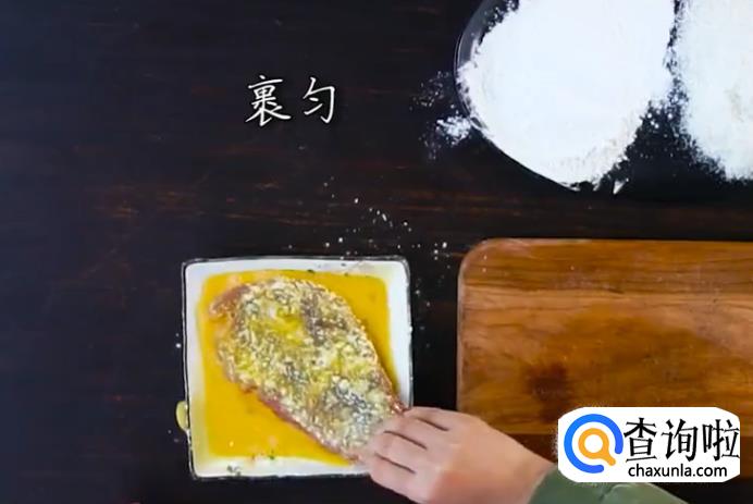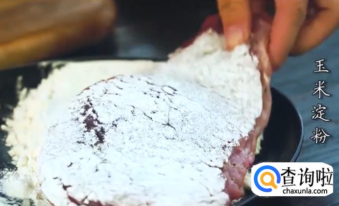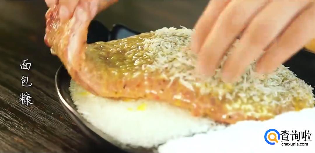 将猪里脊肉表面依次均匀的裹上玉米淀粉、蛋液、面包糠。