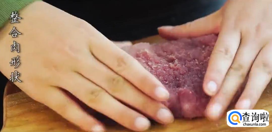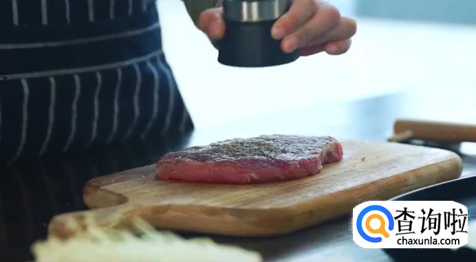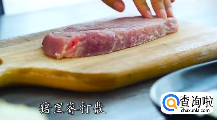 用料理锤敲打猪里脊肉,将猪里脊肉打散;打散后微微整合肉的形状,在其表面均匀的撒上食盐、胡椒粉。