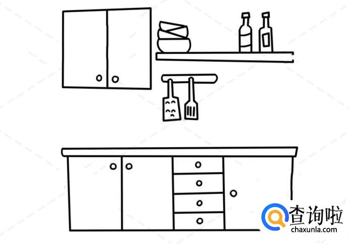 然后我们增添一些细节,比如厨房的灶台,锅铲,还有一些抽屉等等,增添细节可以使我们画出来的厨房更加的真实。