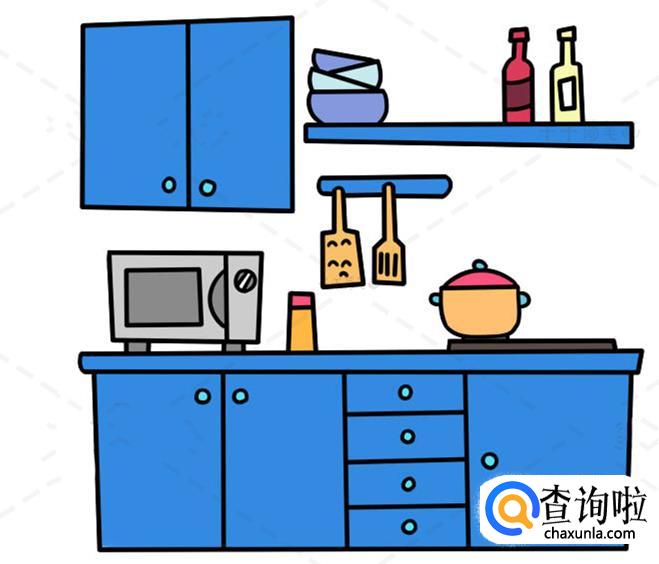 最后我们用蓝色作为主基调给厨房的柜子上色,然后我们再用一些其他的颜料给厨房里的其他东西,比如锅铲,微波炉还有碗进行上色,这样我们的简笔画画厨房就画好了。