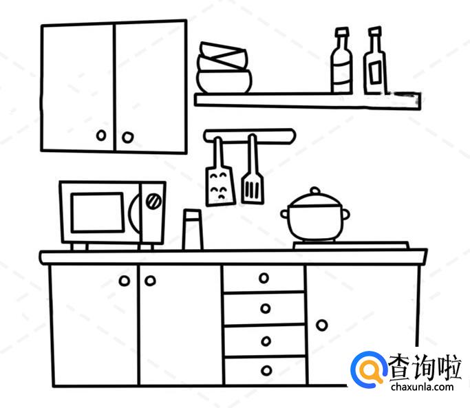 厨房是我们每天都要去的地方,我们对于厨房也已经十分的熟悉,如何用简笔画画出我们心目中的厨房,下面为大家演示一些画厨房的方法。