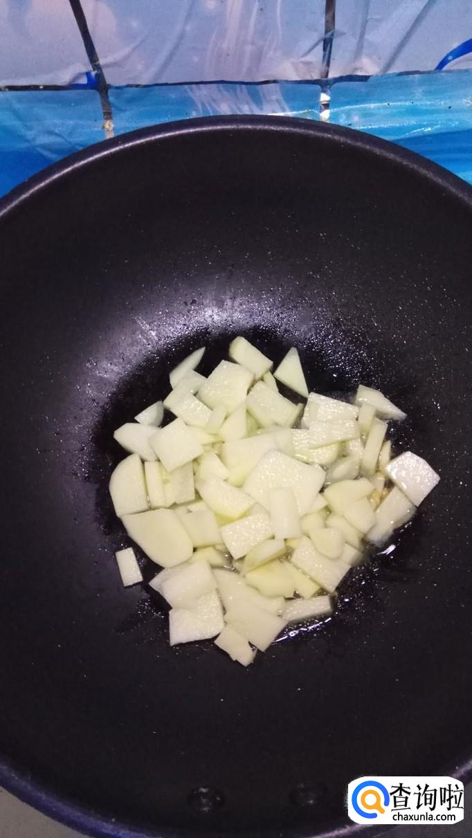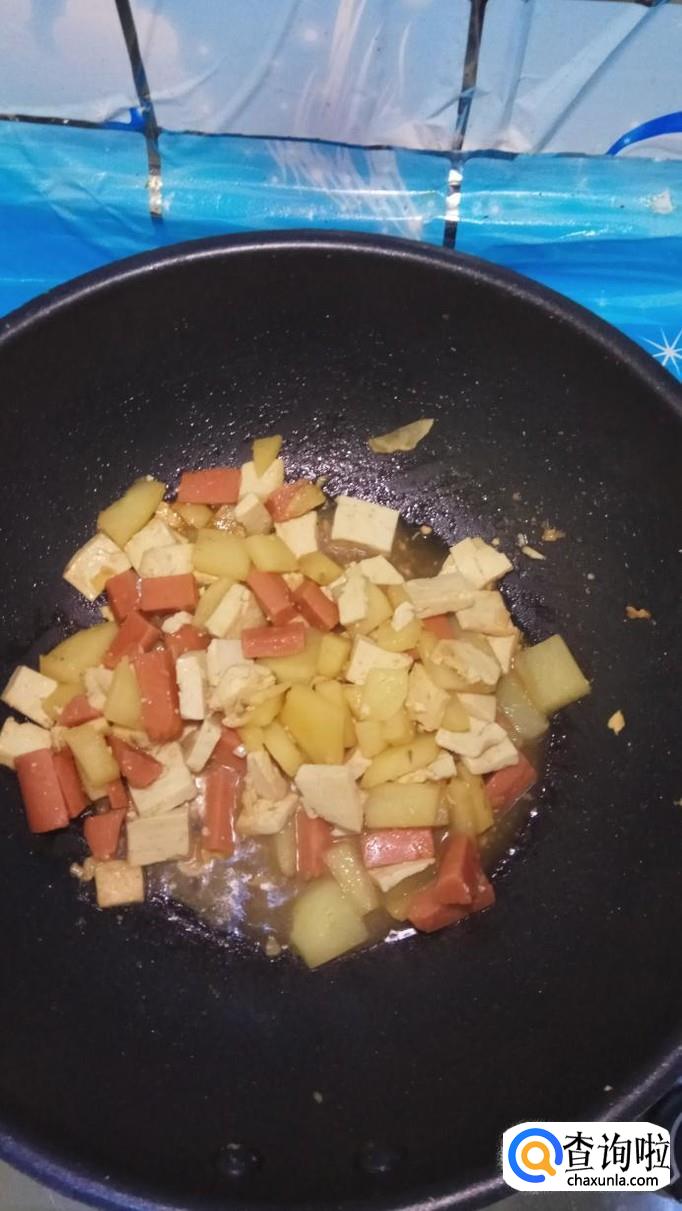 将准备好的土豆块倒入锅中翻炒均匀,然后将火腿肠也倒入锅中,与土豆一起翻炒。