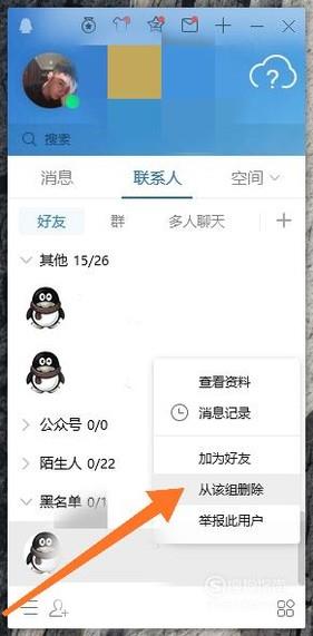 如果需要移除黑名单,首先到黑名单分组内,鼠标选中需要移除的QQ账号然后单击鼠标右键,选中从“从该组删除”或“加为好友”即可。