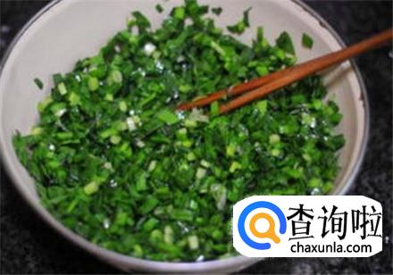 韭菜清洗干净,然后控干水分,一定要控干水分,然后切成韭菜末,倒入一点食用油不断翻搅,这样能够防止韭菜下水。