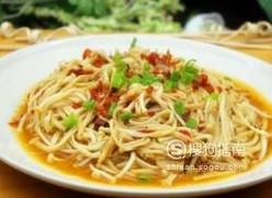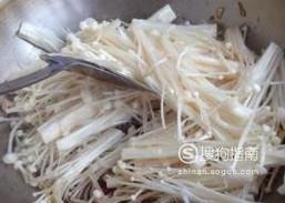 起一口锅烧油,油热后放入洗好的金针菇,开大火爆炒。