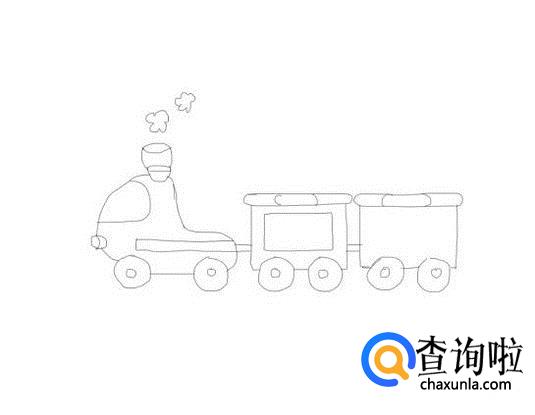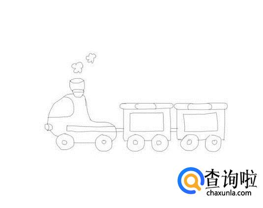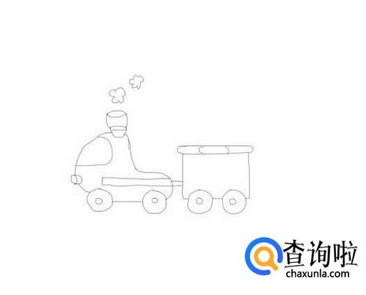 再在火车头的后面再画出火车的一列车厢,然后再画出车厢的轮子,如图所示: