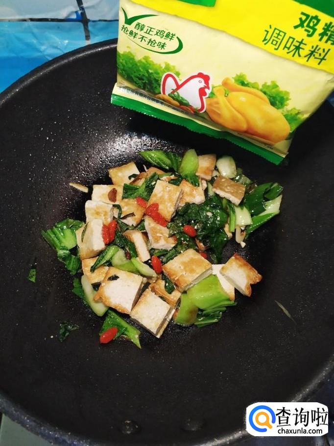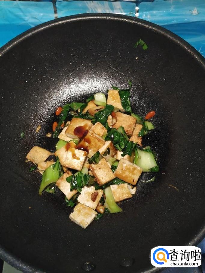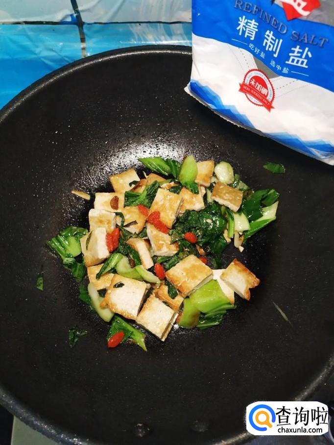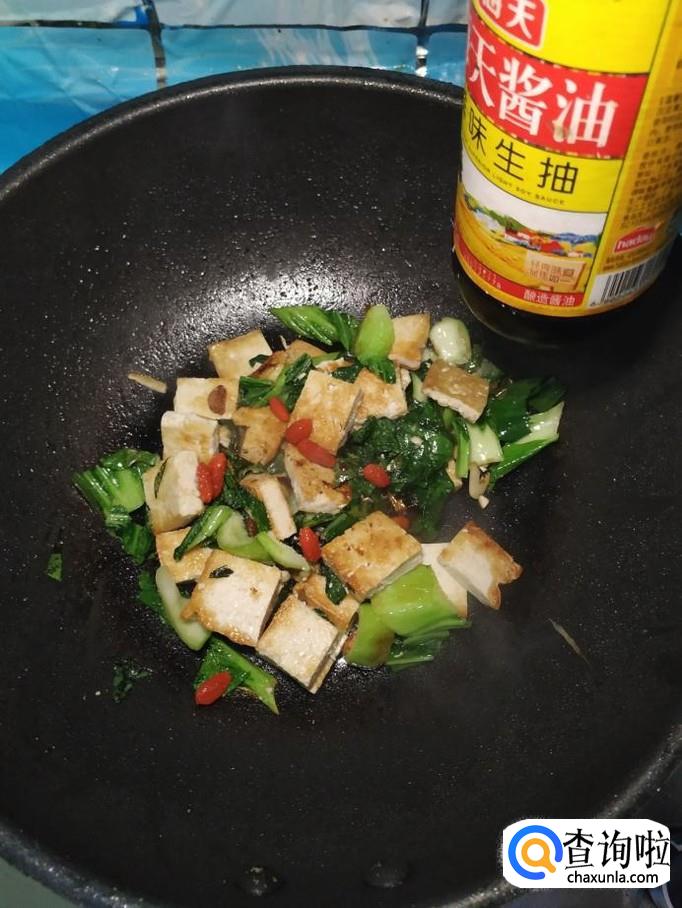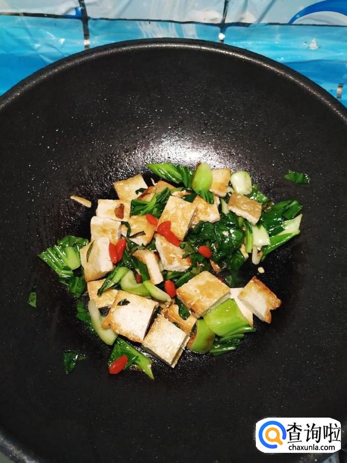 炒至油菜变软之后,将煎好的豆腐倒入锅中,再将泡好的枸杞子也倒入锅中,翻炒均匀。