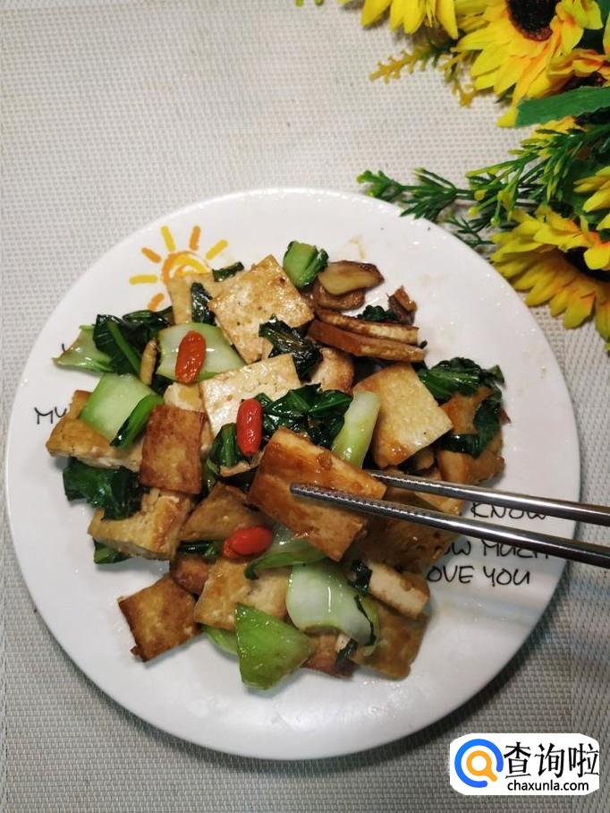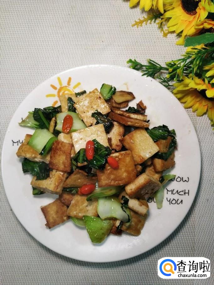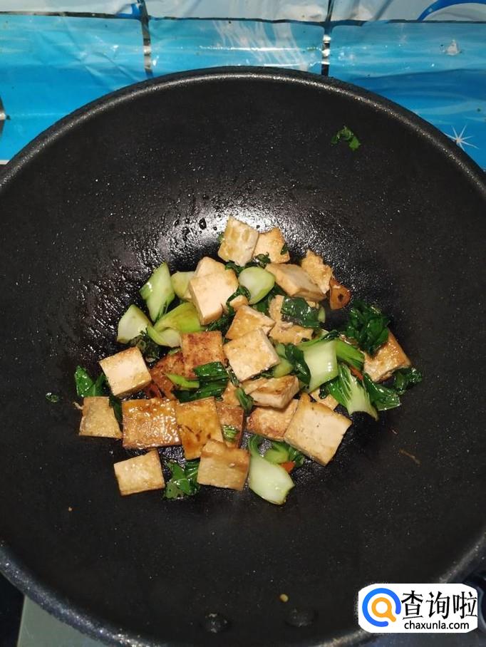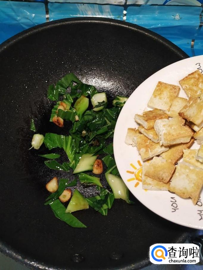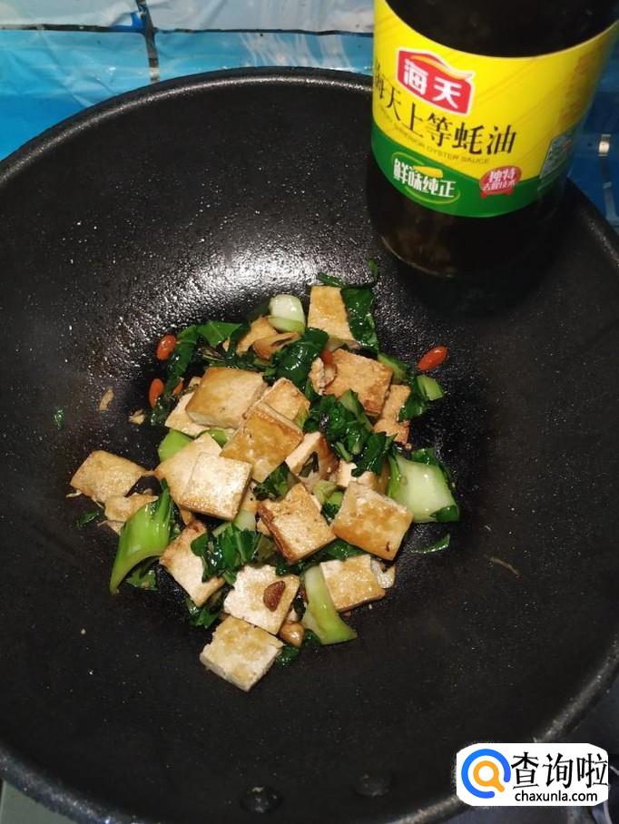炒至油菜变软之后,将煎好的豆腐倒入锅中,再将泡好的枸杞子也倒入锅中,翻炒均匀。