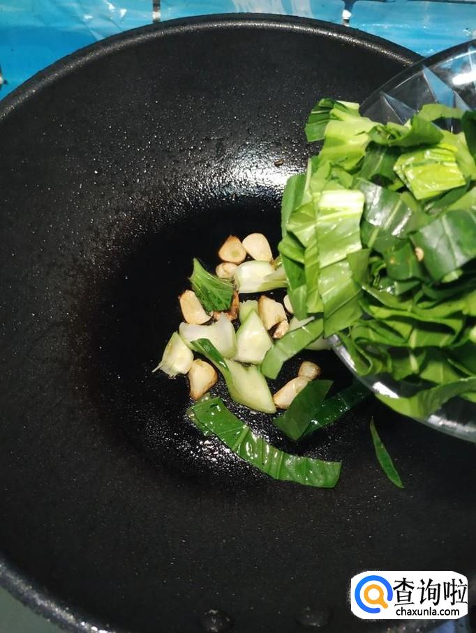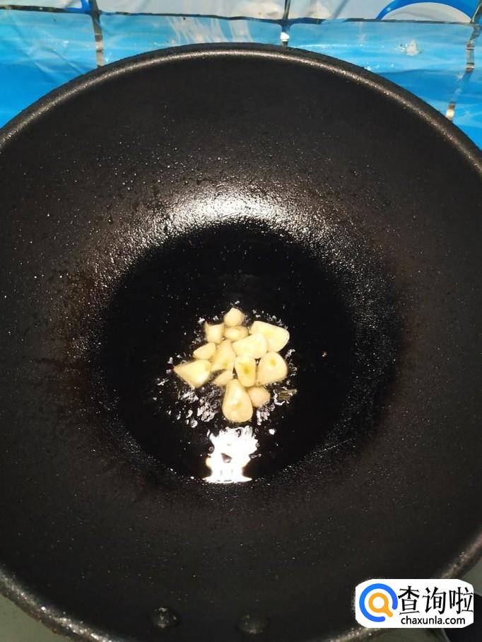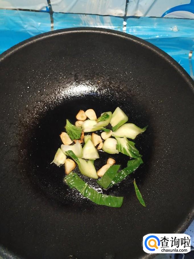准备适量大蒜,去皮,洗净后切成片,炒锅中放入适量油,油热后将蒜片放入锅中炒香,先将油菜帮子放入锅中翻炒一下,然后将油菜叶再倒入锅中,翻炒均匀。