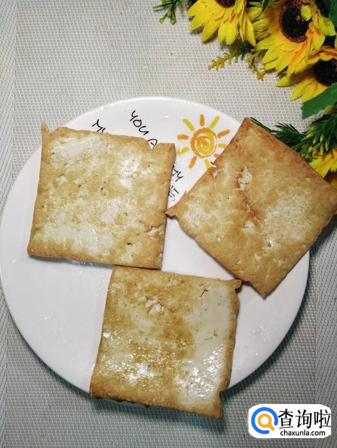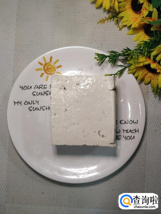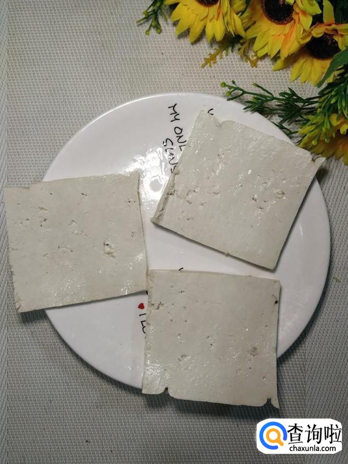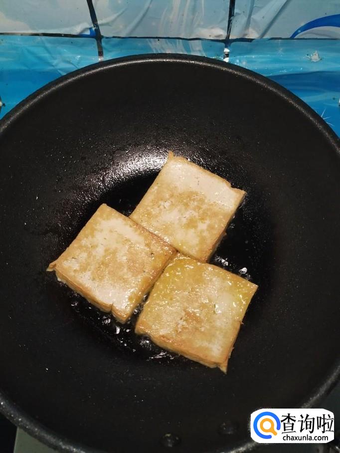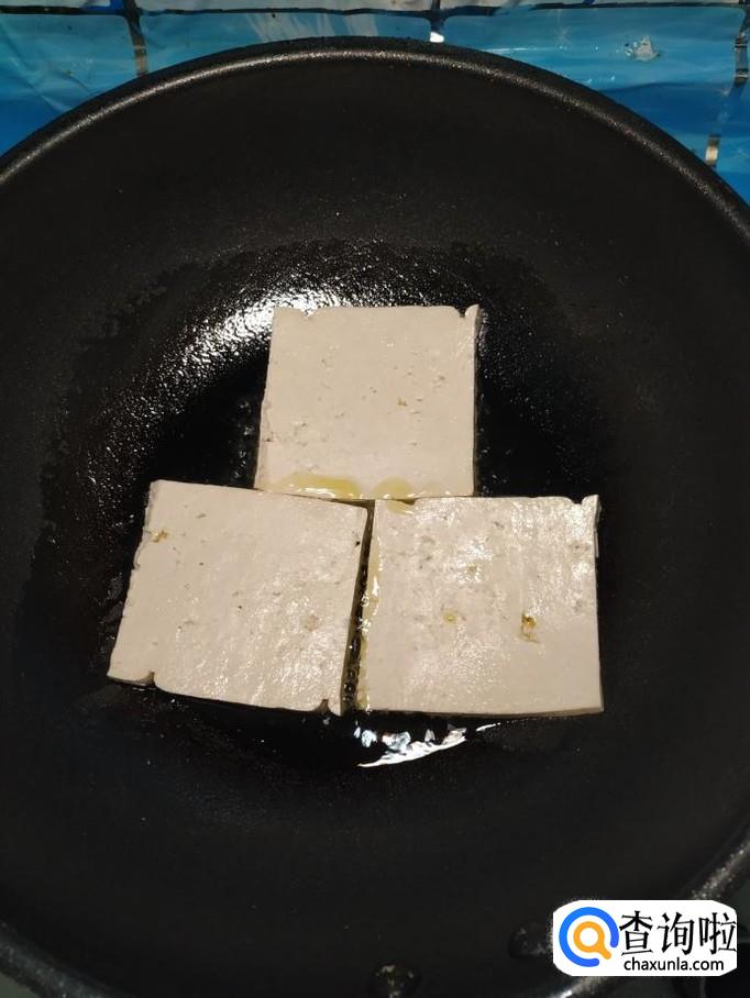 准备适量老豆腐,洗净后,切成大片,放入锅中,小火慢煎。注意,切成大片儿,煎起来非常容易。
