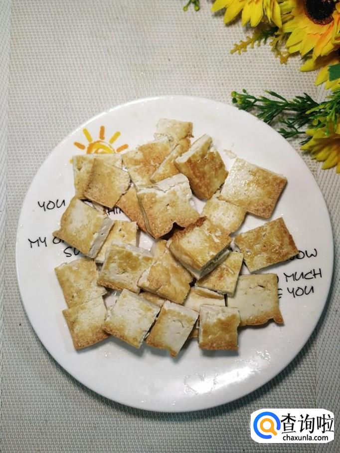 将豆腐煎至两面金黄后,盛出,切成块儿,放入盘中备用。
