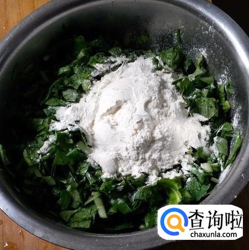 在菜盆里加入面粉。注意哦,面粉要根据你放入多少菜的量定,差不多就行。