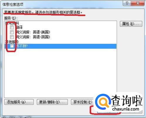 当然,有些人觉得“信息检索”服务有用,我们除了面板中有的服务,还可以点击下方的“添加服务”、“更新删除”、“家长控制”按钮,对信息检索进行自定义设置,添加需要的检索服务,比如,启用家长控制,可以阻止检索到一些不良内容。