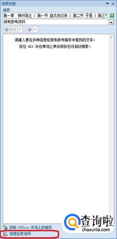 此时,会发现在文档右侧出现了“信息检索”面板,我们点击最下方的“信息检索选项”。
