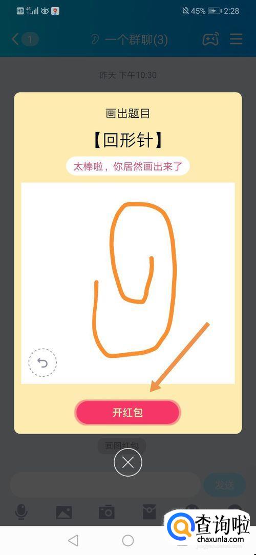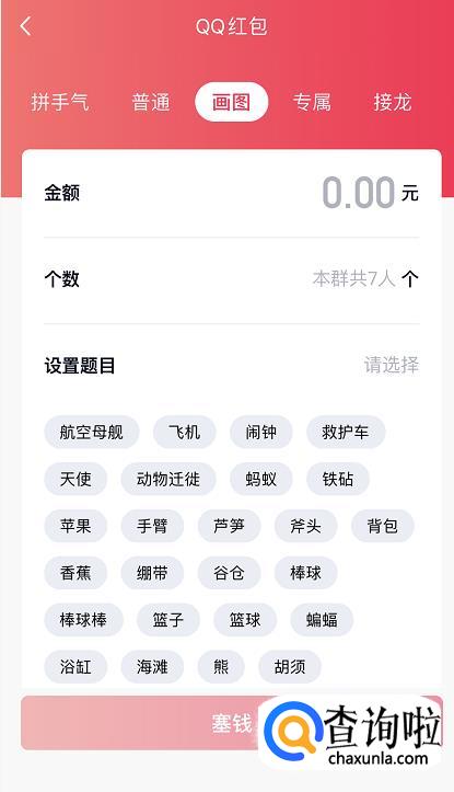 打开手机QQ,点击任意一个对话框,然后点击对话框下方的红包图标,在弹出的菜单栏中选择“画图红包”,接着输入红包金额、个数,并设置好题目,点击“塞钱”就可以发送出来了。你的好友需要根据你设置的题目进行画图,过关成功才能领取红包。