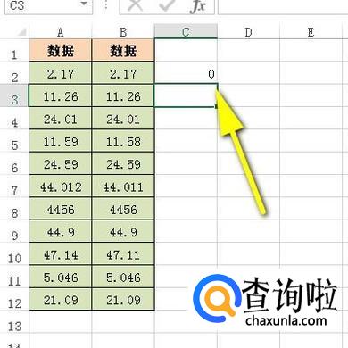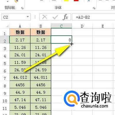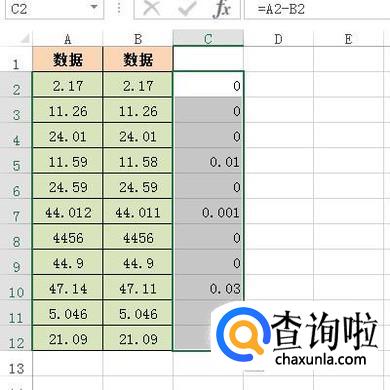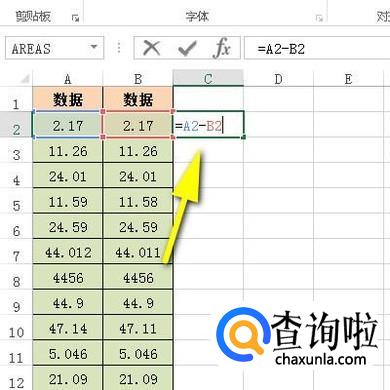 鼠标在C2单元格这里输入:=A2-B2;意思是A2单元格的数据减去B2单元格的数据。如果得数是0的那么,这两个数据是一样的;否则就不一样。