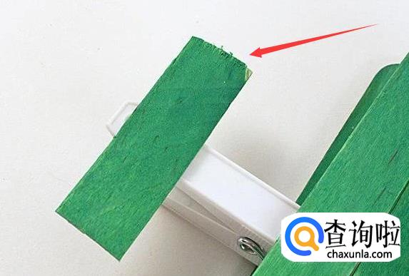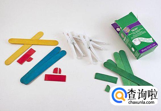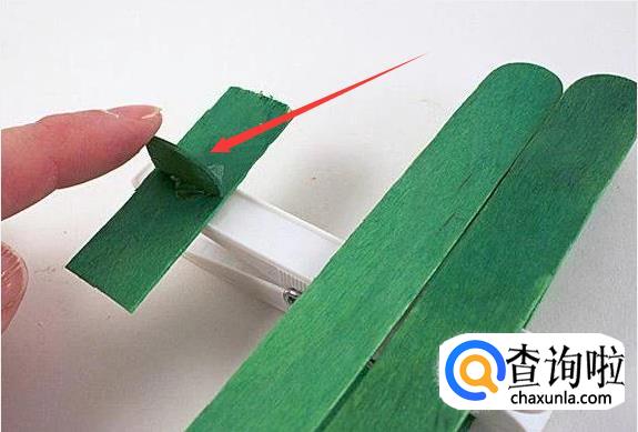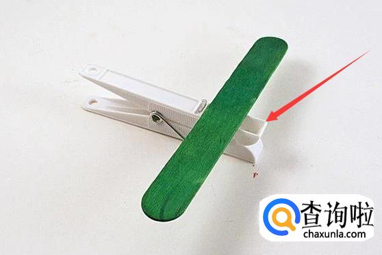 先从工具里面拿出一根雪糕棍,然后把它粘到衣夹的前头,一定要注意不要太靠前了哦!