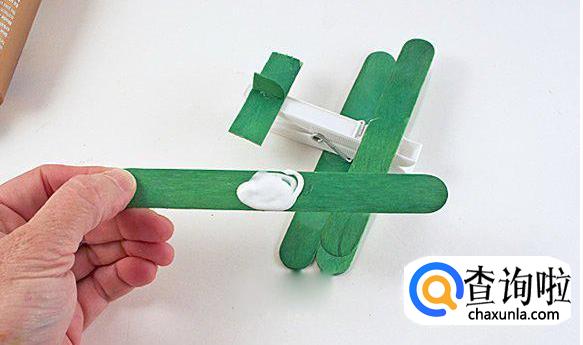 接着再拿出一根雪糕棍,把它剪成比之前几根短三分之一的样子,然后把它作为飞机尾翼贴到衣夹尾端的最后面。