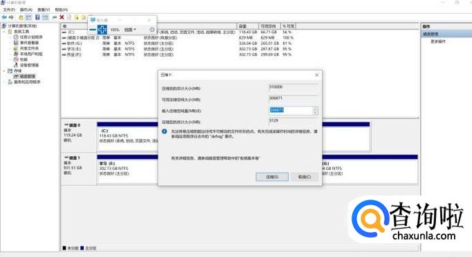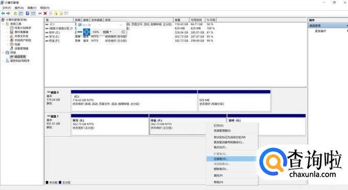 选择你要分区的磁盘,点击右键,然后选择“压缩卷”。系统就会查询压缩空间。稍微等待即可。