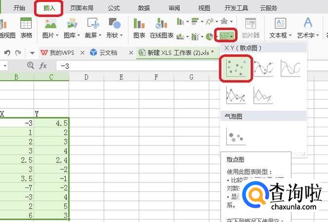 我们把数据都选上,如图所示,点击“插入”,“散点图”,然后选择一种散点图样式。