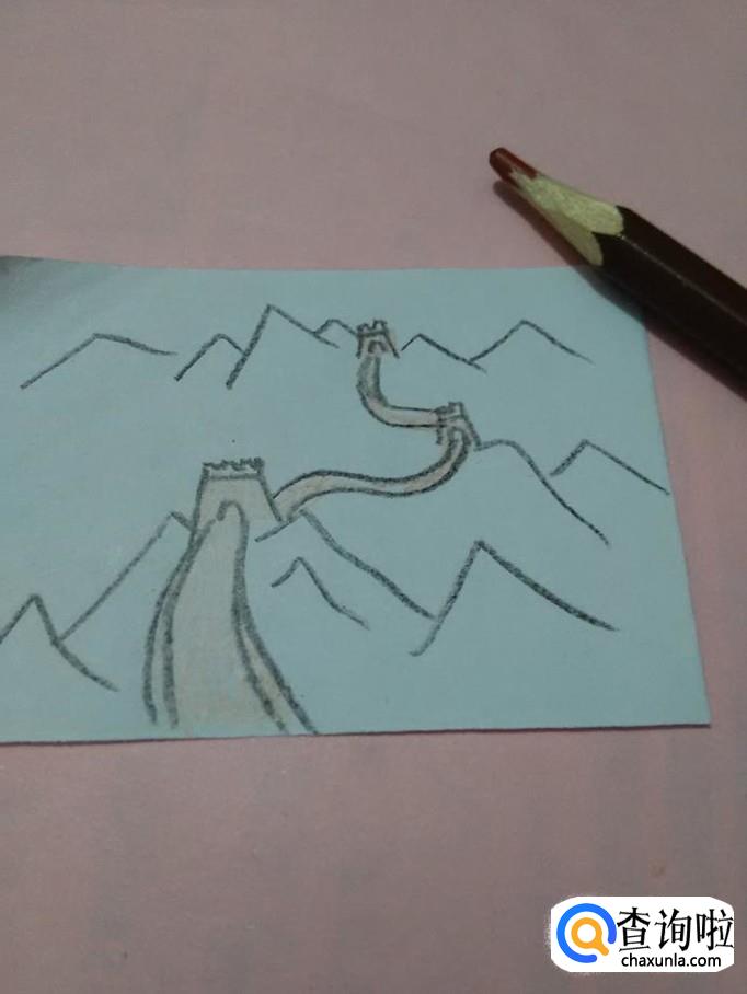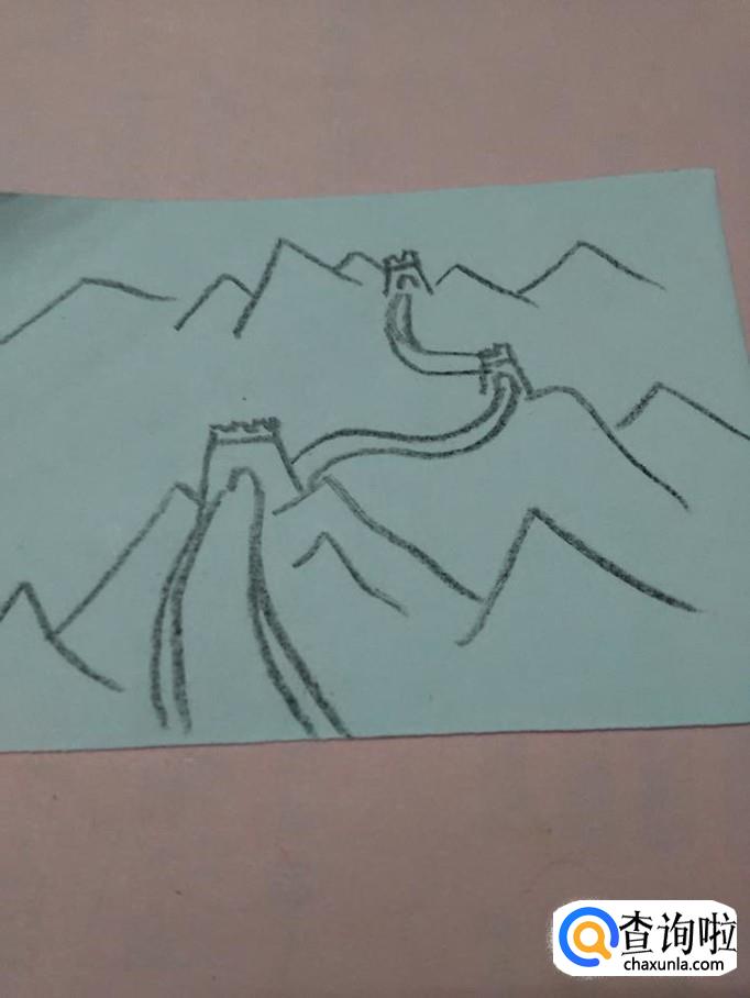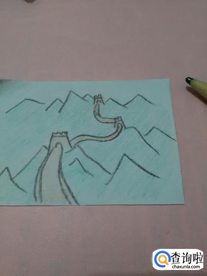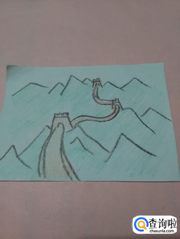 用绿色笔将群山涂成绿色,巍峨的长城就画完了。