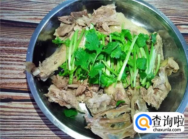 鸭子放凉后,斩块,然后再把香菜均匀铺在上面。