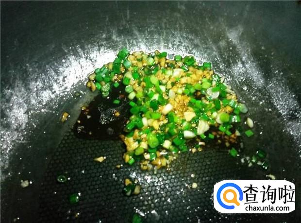 热锅下油,然后把火关掉,放入蒜头和姜煸香,加入适量的盐、蚝油、酱油,再放入香葱,搅拌均匀。