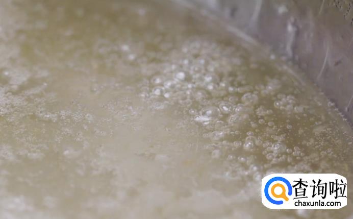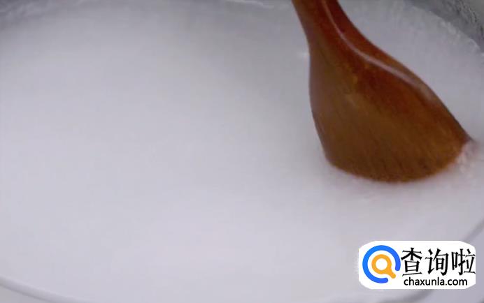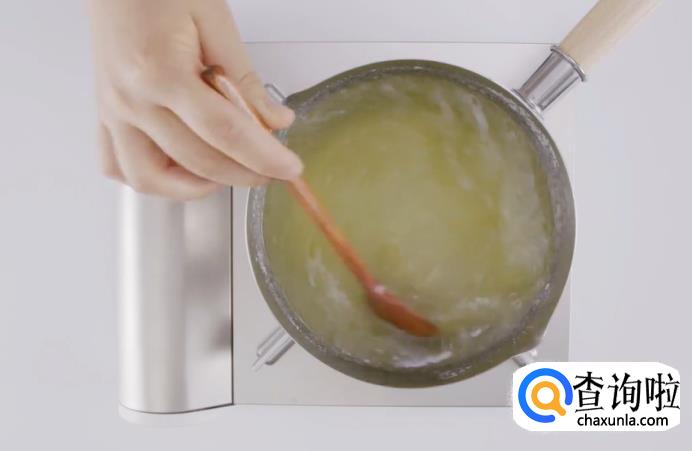 用中小火将其煮沸,煮至粘稠状态。在煮的时候记得用勺子顺时针方向持续搅拌。