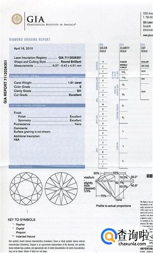钻石证书上会写明钻石的材质和形状,以及钻石的长宽高等各项信息数据,而且是精确到毫米的。