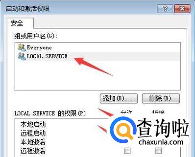 在确定返回的界面,选中“LOCAL SERVICE”这项,在权限设置下面勾选“本地启动”和“本地激活”,然后点击“确定”推出。