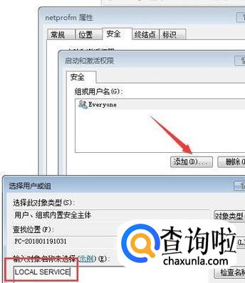 在打开的界面点击“添加”,然后输入对象名称“LOCAL SERVICE”,保存设置。