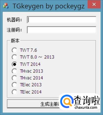 再打开软件包中的“TGkeygen.exe”文件,输入复制的id号或机器码。选择“TWT2014”,再点击“生成注册码”按纽,生成软件注册码。