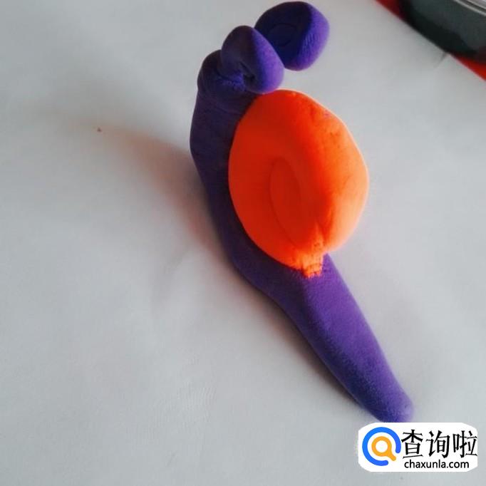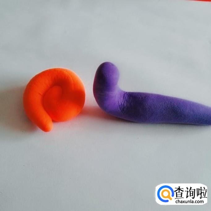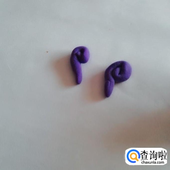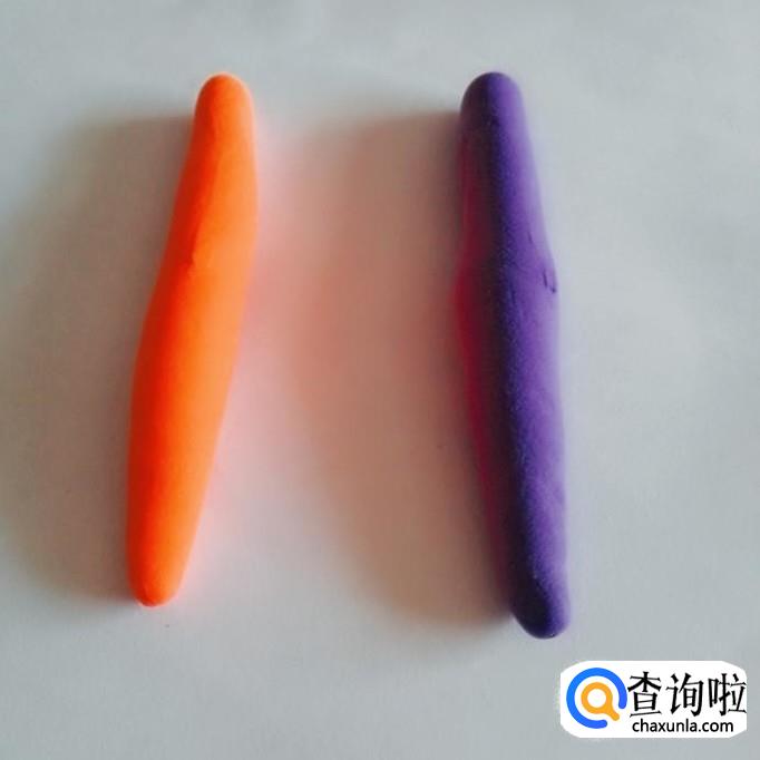 先拿二种颜色,紫色和橙色,搓成二条较长的条形。如图所示。