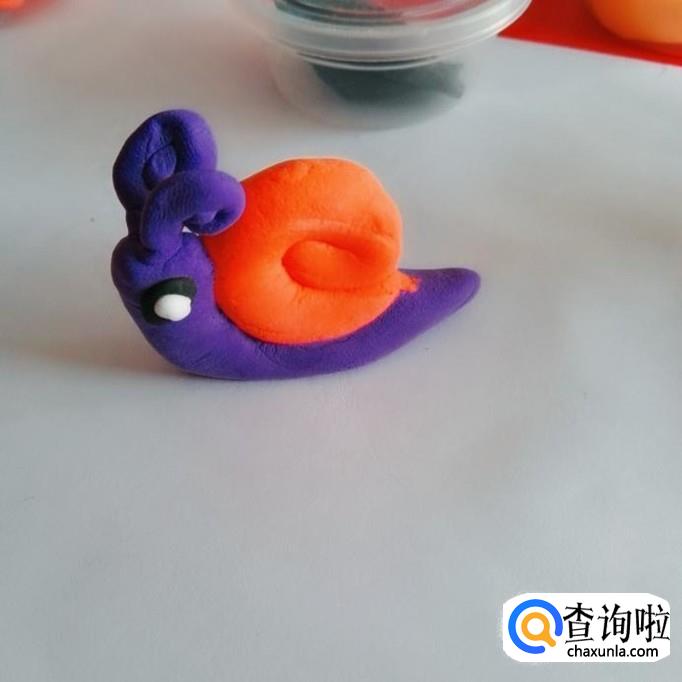把触角粘上去,然后再用黑色和白色彩泥做出它的眼晴,再粘上去,彩泥手工蜗牛做好了。