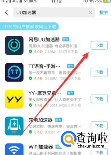 进入之后,搜索“UU加速器”,将其下载安装到手机上面,如图所示。