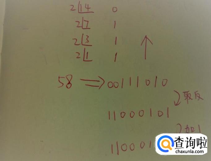 若是负数的十进制转二进制,先按正数的连除法转,将结果按照八位补齐,取反,末位加一,举个例子,还是上图的中的58,先求得二进制,取反后末位加一,得到-58的二进制为11000110