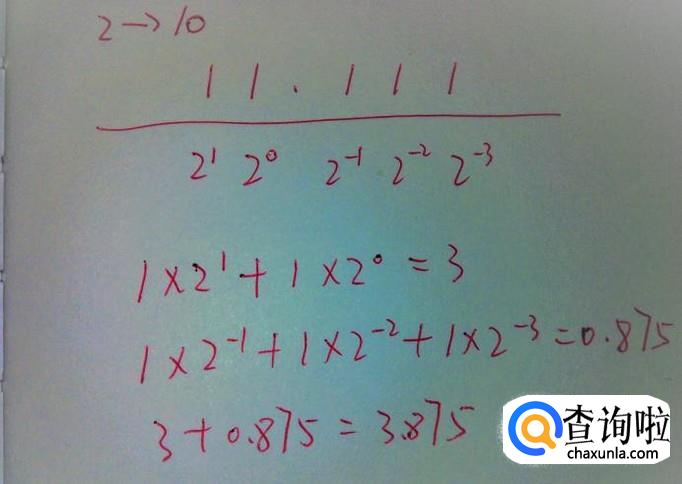 首先是二进制转十进制。介绍一种容易懂的方法,以小数点为界,小数点左一位对应的值为2的0次方,左二位对应的值为2的1次方,左边的类推,次方是递增的,而小数点后面的第一位取2的-1次方,后面的第二位取2的-2次方,右边的类推,次方递减,举个例子如下图,将对应位上的数字相乘,然后相加即可得到十进制的数