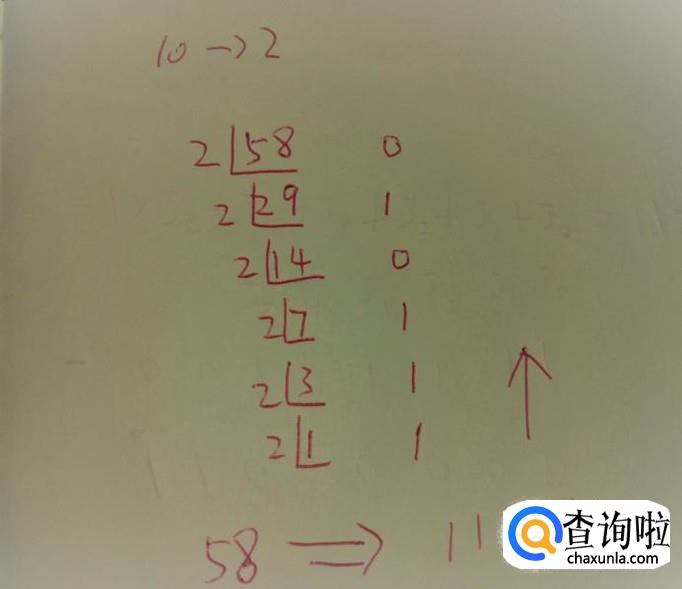 十进制转二进制比较好转,使用连除法就可以,除到商是0为止,然后按倒序排列即可,举个例子