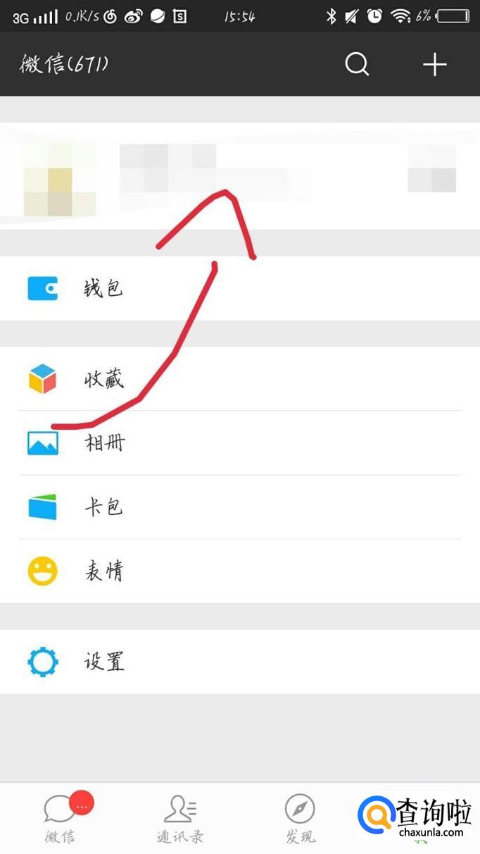 点击自己的微信头像,如图1箭头所示。你会看到出现了一个新的界面,如图2所示。