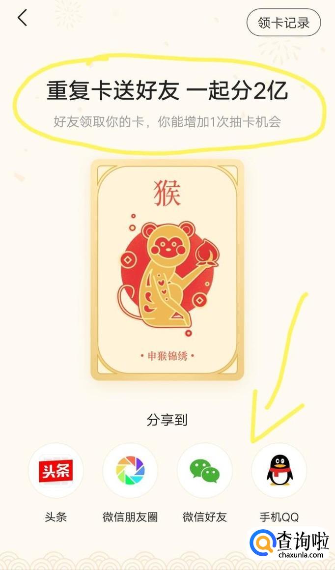 想要送卡给好友,你需要有多余的卡片才行,也就是集卡过程中被丢弃的卡。我们把重复卡送给好友,还可以为自己赢取一次抽卡机会。选择一种分享方式送卡给好友,下面我选择微信送卡。