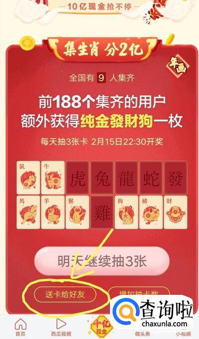 首先打开今日头条,选择下部中间部分的十亿红包点击进入活动,我们选择送卡给好友,如图所示。